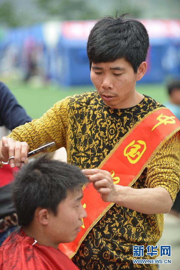 4月25日,在芦山县龙门乡受灾群众安置点,弟弟徐国青给龙门乡受灾群众理发。在四川省芦山县龙门乡晨阳希望学校内的安置点,有忙碌的三兄妹,他们是从安徽蚌埠赶来支援灾区的哥哥徐国军、妹妹徐雪丽和弟弟徐国青,人称“徐氏三兄妹”。在蚌埠,哥哥徐国军从事烟酒经营,二妹徐雪丽和三弟徐国青联合开设了雪丽美容美发连锁机构。三兄妹相伴成长并热心慈善事业,尤其在学雷锋、献爱心的活动中尽其所能。2010年,“徐氏三兄妹”先后被中央文明办评为“中国好人”,荣获蚌埠市“道德模范”称号。四川省芦山“4·20”7.0级强烈地震发生后,徐家三兄妹迅速组织起一支11人的抗震救灾志愿服务队,并紧急筹措26万元资金做救灾款奔赴灾区。4月22日晚上三兄妹到达龙门乡安置点,为雨中的救灾人员和受灾群众送上路途中购买好的雨披。23日、24日两天,三兄妹给龙门乡20余户特困受灾群众家里送去了1000元到3000元不等的慰问金。25日这天,徐雪丽又和弟弟徐国青一起操起老本行,带领着6名发型师,义务为救灾人员和灾区群众理发。新华社记者李鑫 摄