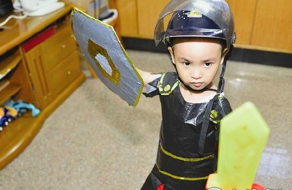选材时,则以“变废为宝”为原则,只选择平日收集的快递包装袋、垃圾袋、泡沫、硬纸板等材料,顶多把老公的旧衣服拿来裁剪。“第一套前后花了三四天时间,之后就很快了,一个晚上就能做一套。”旦妈常在“妈妈群”里和其他家长一起探讨,还特意分享了每一步的制作程序。(记者 蔡晶晶 张伟华)