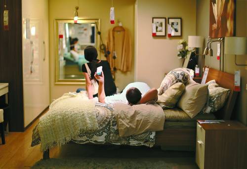 看起来,更多的人并非为挑上一两件家具而来。有外国媒体评论道,这里是观察中国城市居民行为举止的绝佳场合:小情侣旁若无人在沙发区卿卿我我,一家老小占领展示厅开起“派对”,甚至还有人挑张大床睡上一天。(刘婷摄影报道)