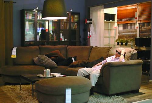 卖场里绝不止是打扮时尚的文艺青年。每一天,这里都涌进很多人。大城市里的生活太累了,人们把自己放倒在暄软的大床上,或是斜靠在柔软的沙发里。反正这里到处是“躺下试试”的标牌。