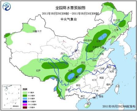 29日08时至30日08时,新疆西南部和天山地区西部、青藏高原中东部、西北地区东部、内蒙古中东部、东北大部、华北、黄淮西部、江汉大部、四川盆地大部、云南中西部等地有小到中雨或雷阵雨,其中,西藏东南部、内蒙古东南部、河北东北部、云南西部、四川盆地西南部和北部等地的部分地区有大雨。内蒙古、东北中南部等地有4~6级风。东海东北部海域将有8~9级大风,阵风可达10~11级。东海西部海域将有5~7级偏北风;