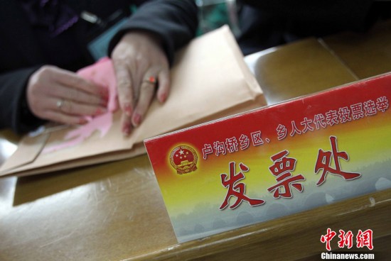 11月8日,北京市900多万选民将投票选举产生新一届区县、乡镇人大代表,据北京市选举办公室统计,全市共依法产生两级人大代表正式候选人21760名。图为卢沟桥乡第一联合选区的万泉寺二选区工作人员现场拆封选票。中新社发张宇 摄