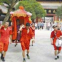 20日是农历六月十八,次日就是观音故里广德寺、灵泉寺这两座千年古刹一年一度的“香会节”。记者于21日上午在广德寺圆觉桥广场看到,一顶大红花轿被抬了出来。许多游客好奇地坐上花轿,重温流传了数百年的乘轿拜山的盛况。