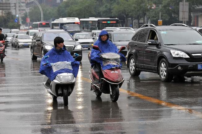 10月14日,市民冒雨在太原街头骑行。当日,受较强冷空气影响,太原市出现大风、降温和降雨天气。太原市气象台发布寒潮蓝色预警信号和霜冻蓝色预警信号,预计未来48小时地面最低温度将下降到零摄氏度以下,建议有关部门做好防寒潮准备工作。新华社记者詹彦 摄