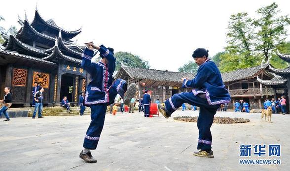 土家族群众在表演摆手舞。摆手舞是土家族最有影响的大型舞蹈,带有浓烈的祭祀色彩。歌随舞而生,舞随歌得名(10月18日摄)。地处武陵山和雪峰山交汇处的湘西土家族、苗族自治州历史悠久,人文荟萃。当地的少数民族群众用自己的勤劳和智慧创造出了具有各自民族特点的历史和文化。无论在居住、服饰、饮食、嫁娶、节庆和文化艺术等各个方面,无不具有各自的风俗习惯和独特的民族特色。新华社记者白禹 摄