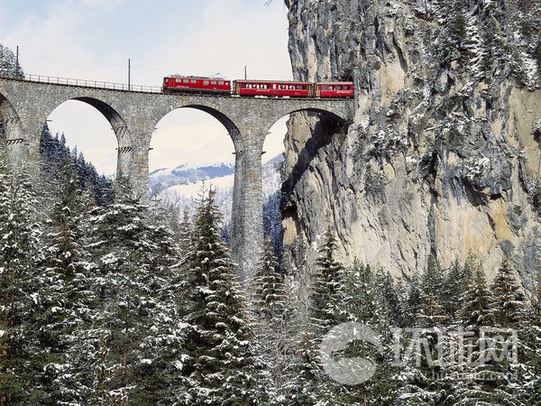 对十九世纪中叶的疯狂探险家来说,瑞士的阿尔卑斯山就是最佳选择,雄伟的山峰,蜿蜒的山谷和从未有人踏足过的净土都能让他们兴奋。经过他们的探险,只有一块地方没有被人类征服——到达那里只有唯一的一条路。但雷蒂亚铁路的阿尔布拉线(1904年通车)和伯尔尼纳线(1910年通车)到达了人类没有到达过的位置。这条铁路由196座高架桥和55条隧道组成,连接了瑞士和意大利的蒂拉诺,其标志性的红色车厢在山脉中非常显眼。
