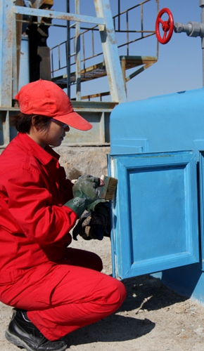 8月21日,采油工阿孜古力正在打扫193 井井口卫生(周建玲 摄)