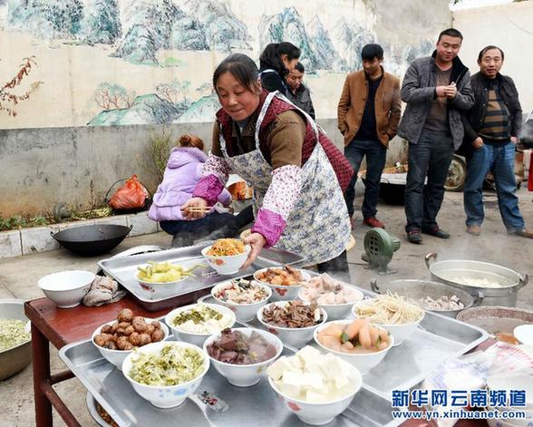 1月16日,在云南省宣威市龙场镇得所村,杨怀珍在为客人准备菜肴。当日,云南省宣威市龙场镇得所村的杨怀珍家杀了三头猪,邀请了几十名亲朋好友来吃“杀猪饭”,亲友相聚,其乐融融。云南的部分地区,尤其是农村,每年的春节前都流行吃“杀猪饭”。到了寒冬腊月的时候,一般有条件的人家就要准备杀猪过年了。辛苦忙碌了一年,杀猪的那天,主人都要大摆宴席,邀请四里八乡的亲朋好友前来,其热闹气氛好比过年。许多农家往往要杀几头猪,当天的新鲜猪肉除了请客人品尝,其余的会做成腊肉、火腿或香肠等,留着过年或开春以后慢慢吃。新华社记者杨宗友 摄