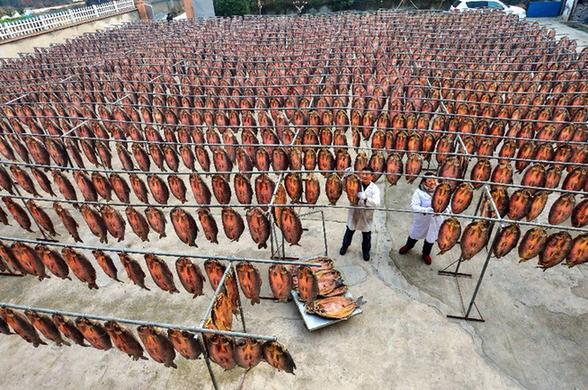 12月25日,仁和镇三白潭村养殖加工户鲁子法的加工厂在晾晒青鱼干。他的加工厂在冬季能加工20000多条传统青鱼干,产值200多万元,带动了周围青鱼养殖加工业。