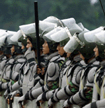 A riot policeman holds up his stick whilst standing on parade during a show of force in the centre of Jakarta yesterday. Indonesia's defiant national police chief, who has refused a presidential order to step aside, skipped the parade of around 8,000 police officers and soldiers that was held to thank the men for their efforts during the last few weeks to keep law and order in the troubled capital. [Reuters]