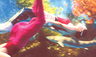Working staff from the Dalian Aquarium dressed like the imaginary mermaid swim with fishes, a move trying to lure more visitors to this coastal city in Liaoning Province. [China News Service]