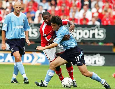 Sun Jihai (R) fights for the ball with Charlton's Kevin Lesbie in a Premiership match August 17, 2003. Sun Jihai scored at 83th minute as Manchester City won the match 3-0.