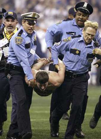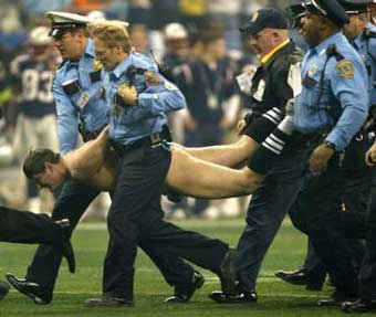 Police after he delayed the start of the second half of Super Bowl XXXVIII