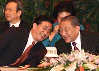| | ;Vice-Premier Li Lanqing (R) talks to Shanghai Mayor Chen Liangyu Thursday at a celebration marking Shanghai's winning bid for the 2010 World Expo at the Shanghai International Convention Centre. On Tuesday Shanghai beat four other cities and won 54 votes out of 88 member countries in the final round. [newsphoto.com.cn] | |