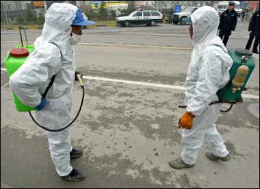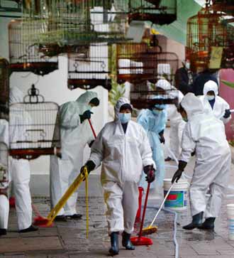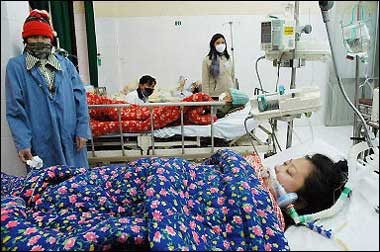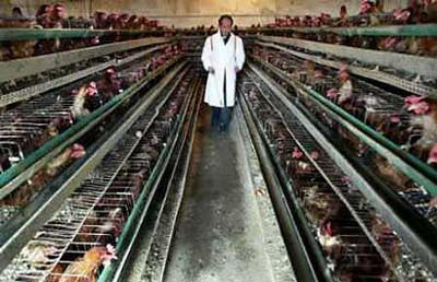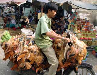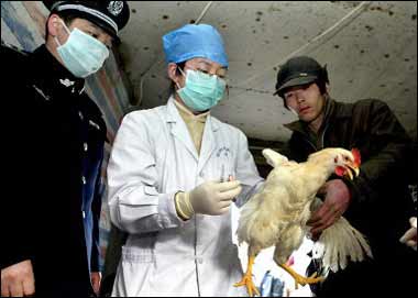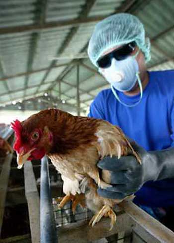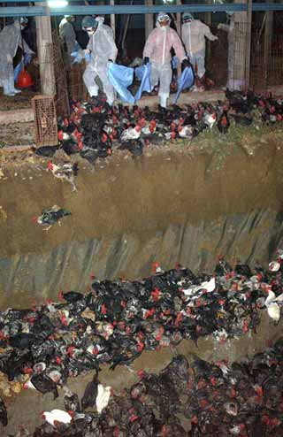 | | | | | | | | | | | | |  | | | A Thai livestock official collects chickens to be destroyed at a farm in Supanburi province, January 25, 2004. Thailand brought in troops and prisoners Sunday to kill millions of chickens and stop the spread of highly contagious bird flu, which has jumped to humans in Viet Nam and Thailand and now spread to Indonesia. With most people fearing contamination, 400 soldiers were drafted to kill the hens in Suphan Buri province northwest of Bangkok. [Reuters] | | | | | | | | | | | | |  | | | Health workers in Taipei throw chickens which may be infected with bird flu in a pit, Sunday, January 18, 2004. Taiwan began culling 55,000 chickens at a farm in the island's south on Saturday after a mild form of bird flu was discovered. [Reuters] | | | | | | | | | | | | |  | | | A 15-month-old baby girl breathes with assistance during her treatment for the avian influenza strain A in an Hanoi hospital January 14, 2004. Viet Nam on Wednesday reported two more suspected bird flu cases,the baby girl and a man and up to 12 Vietnamese died from 'bird flu.' Vietnamese health officials said pigs could be possible carriers of the illness. [Reuters] | | | | | | | | | |