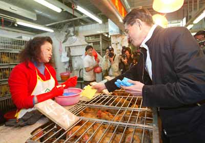 | | |  | | | A chicken is tested for the bird flu virus at a poultry farm in Beijing. Beijing, hit hard by last year's SARS epidemic, has stepped up checks for the bird flu virus sweeping across Asia. [Agencies] | | | | | | | | | | | | |  | | | Ou Guangyuan, deputy Party Secretary of South China's Guangdong Province, dines at a chicken restaurant in Guangzhou on February 3, 2004 to boost confidence with bird flu virus-free chicken food. Ou said poultry and chicken products on Guangdong market are safe and people should not overreact to bird flu. Poultry sales has dropped sharply since after China's first bird flu case was discovered in Guangxi Zhuang Autonomous Region on January 27. [southcn] | | | | | | | | | | | | |  | | | Workers clean the "bird garden", a street selling pet birds in Hong Kong February 3, 2004. The death toll of victims from bird flu rose to twelve on Monday in Asia. [Reuters] | | | | | | | | | | | | |  | | | Live poultry vendors queue up for free influenza vaccination at a clinic in Hong Kong February 2, 2004. Two more people in Vietnam have die after contracting bird flu, bringing to 12 the number of deaths in an epidemic that is sweeping Asia and which scientists fear may now be transmitted from person to person. [Reuters] | | | | | | | | | | | | |  | | | A chicken is left in its cage at an outdoor market in Beijing on February 2, 2004. Chicken vendors in China's capital said business had declined an estimated 70 percent since the outbreak of bird flu on the mainland. [Reuters] | | | | | | | | | | | | |  | | | A student has his temperature checked for symptoms of the deadly bird flu virus at a college in Hong Kong February 2, 2004. The territory's worries over the spread of bird flu across Asia is growing after experts reported a possible case of human-to-human transmission in Vietnam. [Reuters] | | | | | | | | | | | | |  | | | A Chinese shopper walks past a row of shutdown poultry stalls at market in Shanghai February 2, 2004. China's densely populated financial hub of Shanghai has halted trade of live poultry in a bid to stop the spread of deadly bird flu, the government said on Monday. [Reuters] | | | | | | | | | | | | |  | | | A worker with the local animal quarantine authorities burns chicken in Chengdu, Southwest China¡¯s Sichuan Province January 31, 2004. More than 20,000 chickens from bird flu hit Guangxi Zhuang Autonomous Region were found at the Chengdu Shuangliu International Airport. All the 20,000 chicken were destroyed to prevent the spread of the virus. [newsphoto] | | | | | | | | | | | | |  | | | Two epidemic prevention staff stop a car for disinfection in Ezhou of Hubei Province. Every vehicle passing in and out Ezhou will be disinfected after the discovery of suspected bird flu case in the region on February 1, 2004. [Xinhua] | | | | | | | | | | | | |  | | | A chicken is tested for the bird flu virus at a poultry farm in Beijing.Chinese officials now have reports of confirmed or suspected bird flu cases in one third of the country.[Agencies] | | | | | | | | | | | | |  | | | Two health workers wearing full protective gears and holding disinfectant sprayers stand guard in Shanghai.Chinese officials have ordered efficient measures to guard against the virus as more suspected cases were found in five provinces.[Agencies] | | | | | | | | | | | | |  | | | A fresh roast Peking duck is served to American tourists Loralee Blocn (left) and James Johnson (second left) at the Hepingmen Quan Ju De Roast Duck Restaurant, Feb 1, 2004. The ducks used at such restaurants come from exclusive farms and go through strict quarantine before sent for one-hour roasting, Beijing officials said. [newsphoto] | | | | | | | | | | | | |  | | | Dr Yeoh Eng-kiong, Hong Kong secretary for health, welfare & food, urges a chicken vendor to wear protective gear when handling live poultry at Yeung Uk Road Market in Tsuen Wan January 27, 2004. [newsphoto] | | | | | | | | | | | | |  | | | A masked worker checks a chicken at a sealed-off chicken farm in Qingyuan, southern China, January 28, 2004. China has begun the slaughter of poultry near three far-flung farms to halt the spread of the deadly bird flu virus, a day after a discovering an outbreak near its border with Vietnam. [Reuters] | | | | | | | | | | | | |  | | | Chickens look out from their cage at a Hong Kong market on January 28, 2004. The bird flu virus sweeping Asia was found in ducks in China, the Chinese government said that no infections had been found in humans. The majority of live chickens available in Hong Kong are imported, mainly the Chinese mainland. The chickens are all vaccinated against bird flu while ducks and geese are checked to be in good health condition. [AP] | | | | | | | | | | | | |  | | | Relatives stand beside patients suspected of having contracted the bird flu virus. Vietnamese health authorities said there are two new confirmed deaths from the bird flu outbreak.[Agencies] | | | | | | | | | | | | |  | | | A farmer sprays disinfectant at his chicken farm in Wuhan, the capital of China's central province of Hubei, January 28, 2004. The 10 Asian countries hit by the rapid spread of bird flu that has killed at least eight people and threatens to develop into an epidemic worse than SARS promised to fight it together. [Reuters] | | | | | | | | | | | | |  | | | A man eats fried chicken at lunch time at Kentucky Fried Chicken retaurant in Jakarta. KFC in Vietnam already had closed serving chicken, but would switch to a fish menu as the bird flu sweeps around Asian countries.[Reuters]