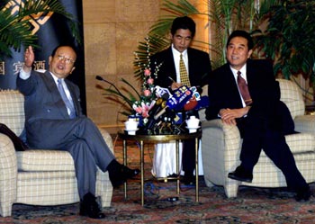 | | Chen Yunlin, director of the Taiwan Affairs Office, discusses the issue of direct cross-Straits chartered flights with John Chang (left) from Taiwan in Beijing Friday. The existing ban on direct transport links between Taiwan and the mainland means both cargo and passengers have to travel via a third location, usually Hong Kong or Macao, which is not only inconvenient, but also a waste of money and time. [newsphoto.com.cn] |