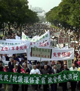 | | Blaring air horns and chanting slogans, more than 10,000 plastic industries workers march in Taipei to demand that the government halt a partial ban on disposable plastic bowls, bags and other utensils, Sunday, Jan. 19, 2002, in Taipei. Taiwan authorities announced in December that disposable bowls, bags and eating utensils made of plastic would be banned in supermarkets, department stores, fast food chains, restaurants and convenience stores. The ban took effect on Jan. 1. [AP] |