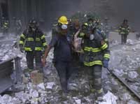 | | Rescue workers remove a man from the debris of the World Trade Center towers in New York City. [Reuters] |