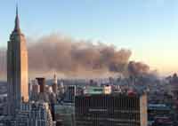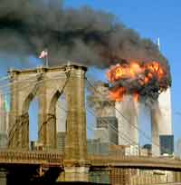 | | The World Trade center tower burns behind of the Brooklyn Bridge on September 11 in New York. [Reuters]. |