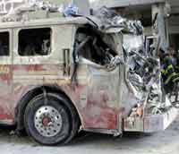 | | A fire truck sits smashed near the World Trade Center in New York on September 11. |
