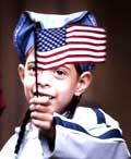 | | Six-year-old boy waves an American Flag outside of St. James United Church in Montreal, where an ecumenical service marked a day of mourning for the victims of the attacks in the US, September 14.[Reuters] |