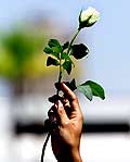 | | A Brazilian student holds up a rose during a prayer vigil for peace and in rememberance of the victims in September 11's attacks in front of the United States Embassy in Brasilia September 21, 2001. [Reuters] |