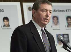 | | US Attorney General John Ashcroft answers a reporter's question at the FBI building in Washington on September 27, 2001. The FBI released photos of the suspected 19 suicide hijackers on the same day.[Reuters] |