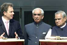 | | British Prime Minister Tony Blair (L) gestures as he looks towards his Indian counterpart Atal Behari Vajpayee (R) during a news conference as Indian external Afairs Minister Jaswant Singh looks on, in New Delhi on October 6, 2001. Blair is in India to garner support for the United States-sponsored global war against terrorism.[Reuters] |