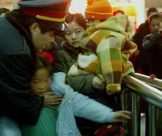 Chinese passengers pass the ticket check points at a railway station in Beijing on January 28, 2004. The country's transportation system is undergoing another test as people are returning to their work after the week-long Spring Festival which ended Wednesday. [newsphoto]