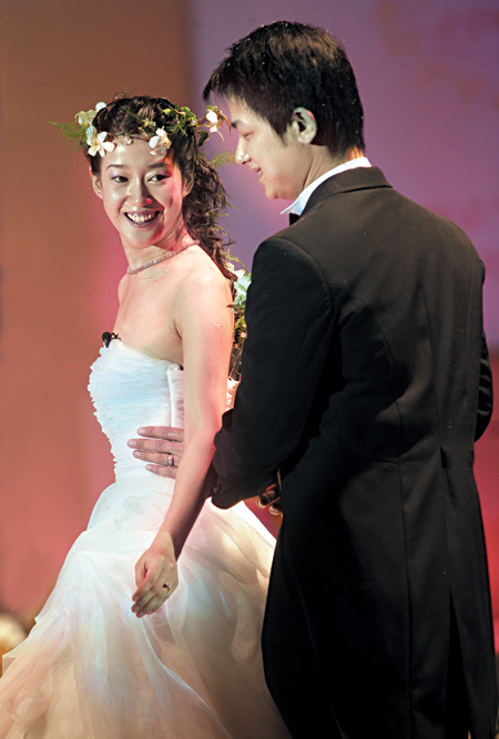 Wedding choreography As the curtain fell, the melody of Elgar's Salut d'amour filled the air and Zhu Jiang and Yang Nan appeared on the stage.