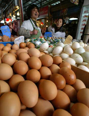 A vendor sells eggs at a market in China's