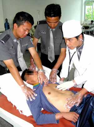 A doctor examines a drug addict under the help of two police men at a voluntary drug rehab. [file photo]