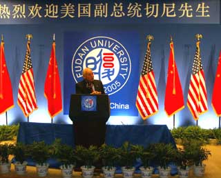 "Just as the US President Bush said, the United States supports one-China policy, based on the three US-China joint communiques." He said one important thing is that discussions and dialogues should be held between Beijing and Taiwan and the United States opposes any unilateral actions to change the status quo. In response to a student's question on nuclear issues in the Korean Peninsula, the vice president said a nuclear-free Korean Peninsula entails the nodding of the Democratic People's Republic of Korea (DPRK) for the complete,verifiable and irreversible dismantlement of its nuclear facilities. The US side hopes the parties should work together to persuade the DPRK to reach the goal. He said the United States was"encouraged" by China's leading role in the field. Cheney said curbing the spread of weapons of mass destruction is of great urgency in the new century and the US side has no choice but persist.