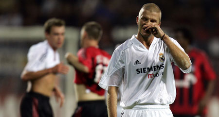 Real Madrid's David Beckham reacts on his team's loss against Bayer Leverkusen after their Champions League Group B soccer match in Leverkusen, western Germany, September 15, 2004. Leverkusen won the match 3-0. [Reuters]