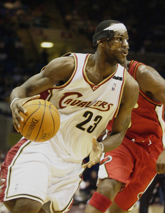 LeBron James of the Cleveland Cavaliers breaks toward the hoop during the fourth quarter in a game with the Atlanta Hawks at Gund Arena in Cleveland, Ohio, January 5, 2005.