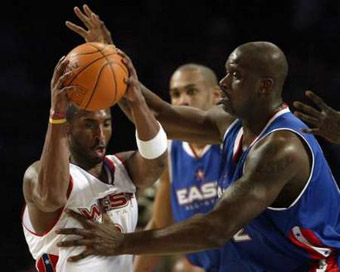 Miami Heat center Shaquille O'Neal (R) fouls Los Angeles Lakers guard Kobe Bryant during the first half of the 54th NBA All-Star Game, in Denver, February 20, 2005. [Reuters]