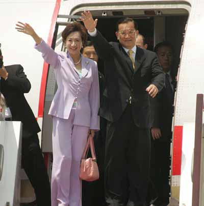 Visiting Chinese Kuomintang (KMT) Party Chairman Lien Chan and his wife Lien Fang-yu bid farewell as they board the plane to Taiwan with a stopover in Hong Kong at the Shanghai Pudong Airport May 3, 2005. Lien said his mainland tour is "pleasant, smooth and successful", and thanked the mainland side for their hospitality.[newsphoto]