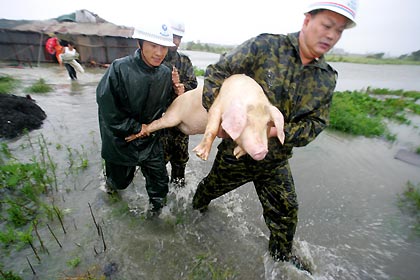 Farmers transfer a pig they raised to safety. [newsphoto]