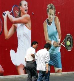 Kim Clijsters of Belgium returns a forehand to Maria Sharapova of Russia during her semifinal win at the U.S. Open tennis tournament in Flushing Meadows, New York, September 9, 2005. Clijsters defeated Sharapova 6-2 6-7 6-3. [Reuters]