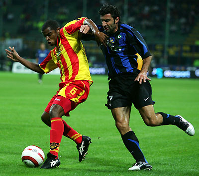 Inter Milan's Luis Figo (R) fights for the ball with Lecce's Angelo Mariano De Almeida during their Italian Serie A match at the San Siro Stadium in Milan, northern Italy, September 17, 2005. [Reuters]