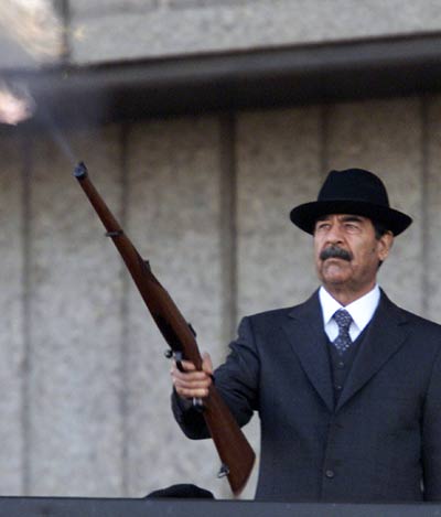 Saddam Hussein fires shots into the air in