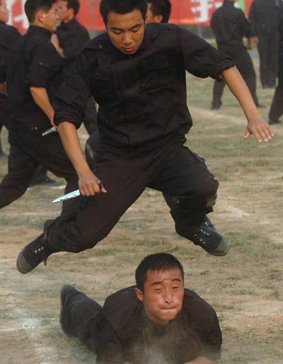 Armed police officers take part in a training session in Zhengzhou, Central China's Henan Province Wednesday November 2, 2005. Their team, composed of 500 members, is tasked with dealing with terror, violence or other emergencies. [Xinhua]