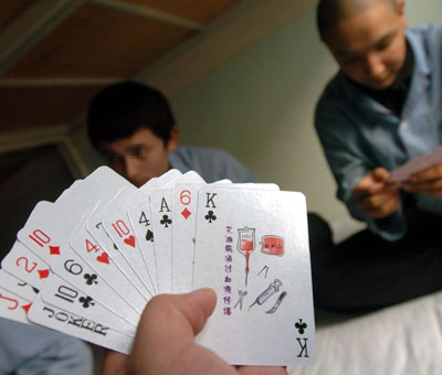 Drug addicts play cards with HIV/AIDS prevention information in a drug rehabilitation center in Urumqi, Northwest China's Xinjiang Uygur Autonomous Region November 30, 2005. [Xinhua]
