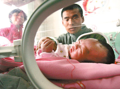 A 15-day-old baby boy receives medical treatment in Liaoyuan, Jilin Province, on Friday. He was safe after being thrown from a second-floor window of the city's Central Hospital, which was gutted by fire on Thursday, and caught by his father on the ground. [newsphoto]