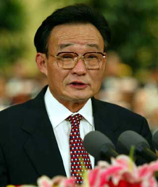 Wu Bangguo, chairman of the Standing Committee of the National People's Congress, delivers a report on the work of NPC at the fourth full meeting the annual NPC session in the Great Hall of the People on March 10, 2004. NPC deputies will also hear work reports from the Supreme People's Court and Supreme People's Procuratorate Wednesday afternoon. [newsphoto]