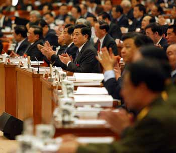 | Jiang Zemin and Hu Jintao join panel discussion of the Army delegation |