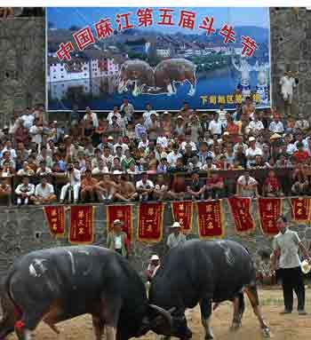 Two bulls fight in a bullfighting competition held in Majiang County, Southwest China's Guizhou Province, on August 18, 2005. The county is of an autonomous region by Miao and Dong minorities. The three-day bullfighting is the ethnic minorities' traditional event. [newsphoto]