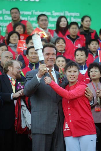 California Governor Arnold Schwarzenegger, left, holds the Special Olympics torch with Yang Yan, a representative of the disabled players at the Special Olympics torch run ceremony at Beijing's Millennium Monument Monday Nov. 14, 2005. [newsphoto] |