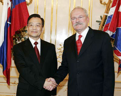 Chinese Premier Wen Jiabao (L) shakes hands with Slovakian President Ivan Gasparovic in Bratislava, capital of Slovakia, December 7, 2005. The two countries have agreed to deepen cooperation. [Xinhua] |